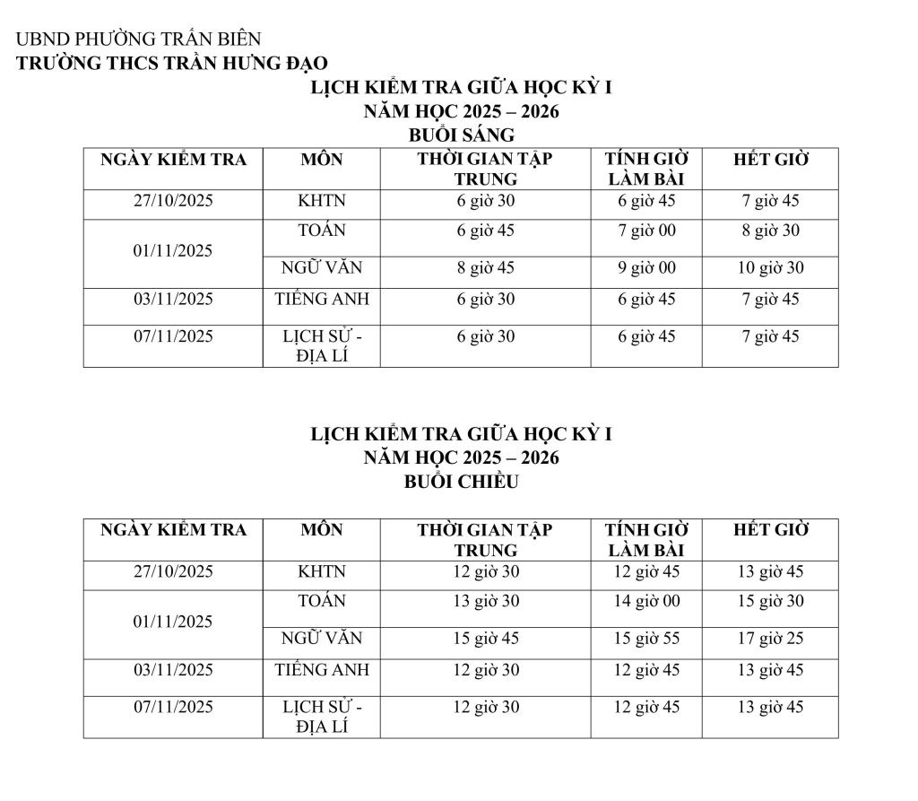 Chào Quý PHHS và các em học sinh, nhà trường gửi đến Quý Anh (Chị) và các em lịch kiểm tra giữa học kỳ I năm 2025-2026 các môn thi chung như sau: